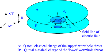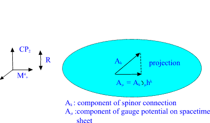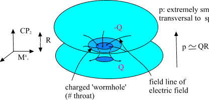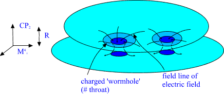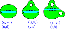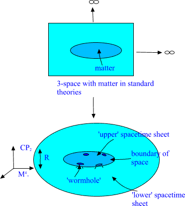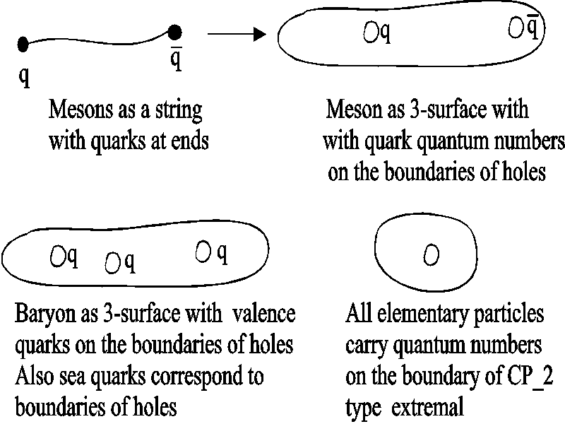 B. Elementary particles as 3-surfaces of size of order R=104 Planck lengths: CP2 extremals. Elementary particles have geometric representation as so called CP2 type extremals. Instead of standard imbedding of CP2 as a surface of M4+×CP2 obtained by putting Minkowski coordinates mk constant mk=const., one considers 'warped' imbedding mk =fk(u) u is arbitrary function of CP2 coordinates with the property that the M4+ projection of the surface is random light like curve: mkl dmk/du dml/du =0, mkl is flat M4 metric. (A) The condition implies that induced metric is just CP2 metric, which is Euclidian! The curve is random and therefore one has classical non-determinism: this makes sense since the solution is vacuum extremal. Fig. 7. The projection of CP2 type extremal to M4+ is lightlike curve. Elementary particles correspond to CP2 type extremals with holes: the intersection of bound with m0=const hyperplane is sphere, torus, sphere with two handles, etc...: shortly a surface with genus g=0,1,2,... . Different fermion families correspond to different genera. Bosons are also predicted to have family replication phenomenon. Fig. 8. Different fermion families correspond to different genera for the boundary component of CP2 type extremal. Feynman diagrams correspond to topological sums of CP2 type extremals: the lines of diagram being thickened to CP2 type extremals: Fig. 9. Feynman diagrams correspond to connected sums of CP2 type extremals: each line of Feynman diagram is thickened to CP2 type extremal. The quantum version of the condition (A) stating that the M4+ projection is light like curve leads to Super Virasoro conditions and it turns out that elementary particles together with their 10-4 Planck mass excitations belong to representation of p-adic Super Virasoro and Kac Moody. The p-adic mass calculations lead to excellent predictions for particle masses. |
