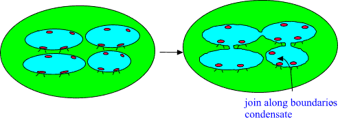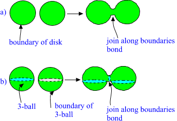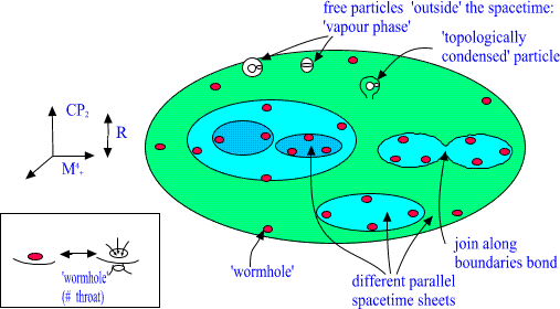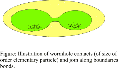 E. Join along boundaries contacts and join along boundaries condensate The recipe for constructing many-sheeted 3-space is simple. Take 3-surfaces with boundaries, glue them by topological sum to larger 3-surfaces, glue these 3-surfaces in turn on even larger 3-surfaces, etc.. The smallest 3-surfaces correspond to CP2 type extremals that is elementary particles and they are at the top of hierarchy. In this manner You get quarks, hadrons, nuclei, atoms, molecules,... cells, organs, ..., stars, ..,galaxies, etc... Besides this one can also glue different 3-surfaces together by tubes connecting their BOUNDARIES : this is just connected sum operation for boundaries. Take disks D2 on the boundaries of two objects and connect these disks by cylinder D2×D1 having D2:s as its ends. Or more concretely: let the two 3-surfaces just touch each other. Fig. 19. Join along boundaries bond a): in two dimensions and b): in 3-dimensions for solid balls. Depending on the scale join along boundaries bonds are identified as color flux tubes connecting quarks, bonds giving rise to strong binding between nucleons inside nuclei, bonds connecting neutrons inside neutron star, chemical bonds between atoms and molecules, gap junctions connecting cells, the bond which is formed when You touch table with Your finger, etc. One can construct from a group of nearby disjoint 3-surfaces so called join along boundaries condensate by allowing them to touch each other here and there. Fig. 20. Join along boundaries condensate in 2 dimensions. The formation of join along boundaries condensates creates clearly strong correlation between two quantum systems and it is assumed that the formation of join along boundaries condensate is necessary prequisite for the formation of MACROSCOPIC QUANTUM SYSTEMS. |